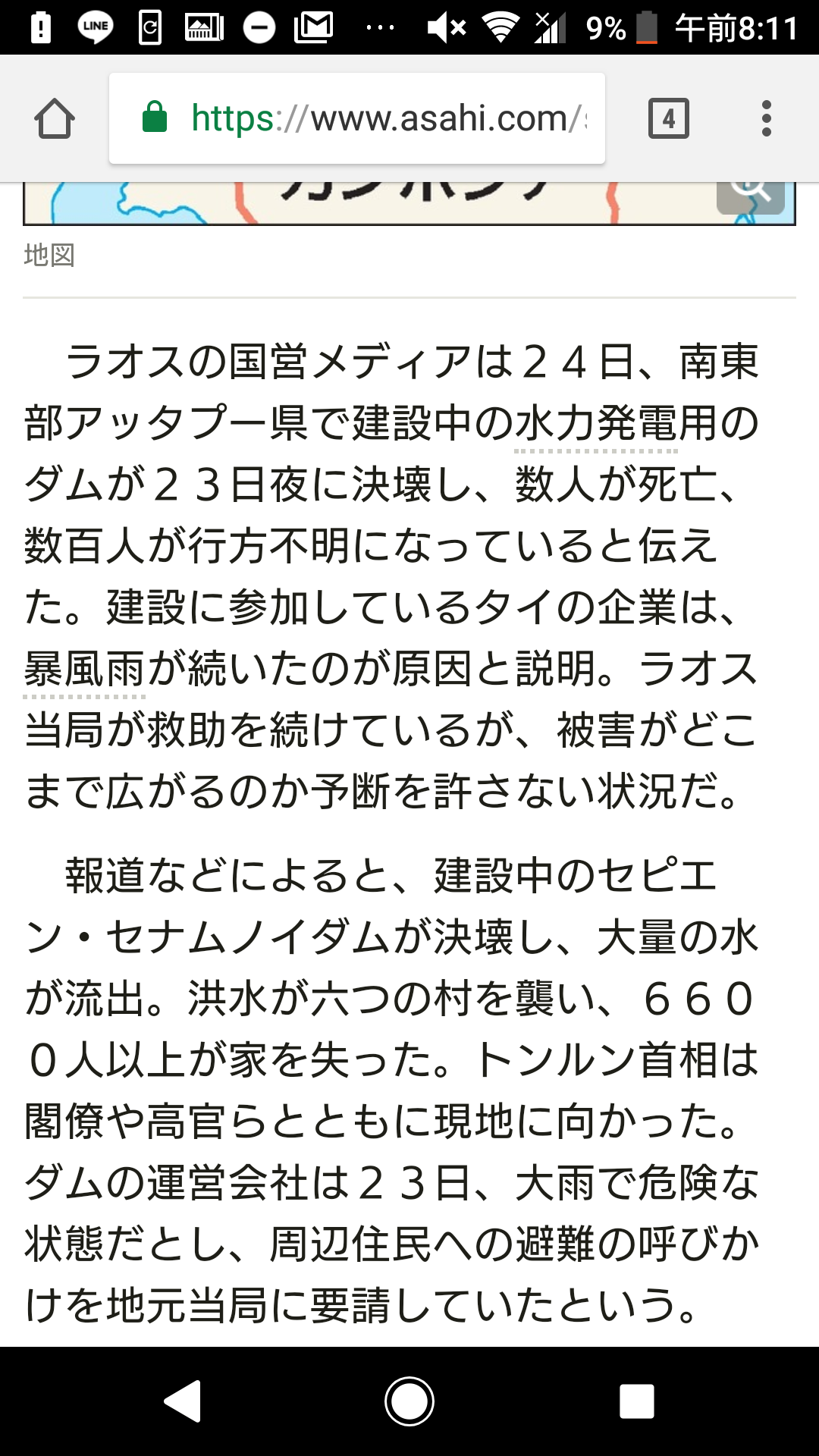 ダムは水力発電用で建設中だった。建設に携わる企業側は、決壊について、暴風雨が続いたのが原因と説明している。