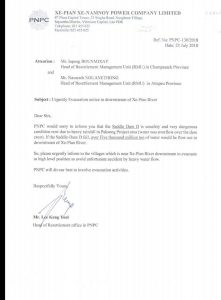 라오스 당국은 댐의 손실이 더 커질 수 있다는 경고를 정오쯤에 받고, 댐 주변 마을에 공식적으로 대피령을 내렸지만 얼마 안 가서 댐은 무너지고 말았다. [이미 대피령을 내렸음에도 피해가 큰 것은 주거지들이 하도 중구난방으로 되어있어서 파악이 쉽지 않았기 때문이라고 한다.]