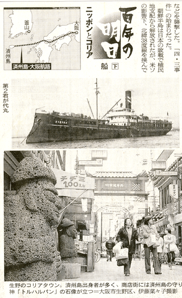 済州4.3事件は1948年4月3日に警察および右翼青年団の弾圧中止と単独政府樹立反対などを掲げて起きた済州の武装蜂起とその後に続いた武力衝突、そして鎮圧の過程で多くの住民が犠牲になった事態をいう。この過程で2万5000-3万人が虐殺され、弾圧を避けるために多くの済州住民が大阪に避難した"