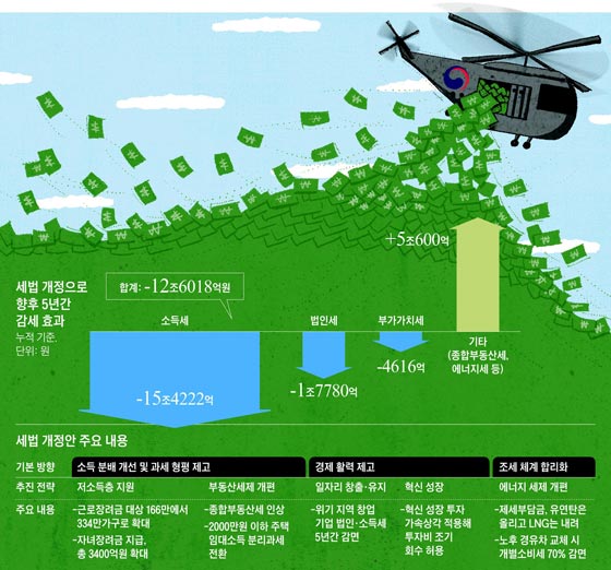 大幅に拡大された労働・子供奨励金の名目で政府が使うお金は、来年3兆8091億ウォン、2020年2兆9648億ウォンなど、今後5年間で合計14兆8240億ウォンに達する。総合不動産税引き上げと相互金融預託金課税などで増える税収が、いくつかのが、奨励金支給規模があまりにも大きく、今後租税支出拡大による税収の減少は、12兆6018億ウォンに達する。政府が税収の減少基調に転換することは、李明博政権時代景気刺激のために所得税と法人税率を引き下げた2008年以来、10年ぶりだ。