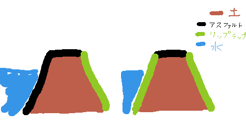 >斜面にアスファルトはない。ちなみにリップラップの下にアスファルトフェーシング