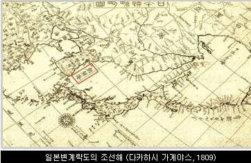 독도 본부 등 독도연구단체에 따르면, 에도막부 천문학자인 高橋景保가 1809년 제작한 日本邊界略圖를 보면, 東海가 朝鮮海로 큼지막하게 표기돼 있다.