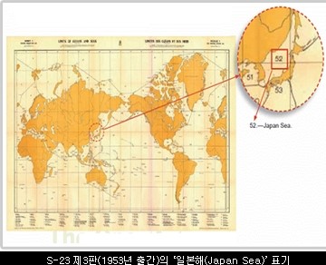 아래 지도는 한국전쟁 당시 국제수로기구가 3번째로 출간한 해양과 바다의 경계한국전쟁 이후 한국은 東海 명칭이 정당하게 반영될 수 있도록 문제 제기를 시작함.