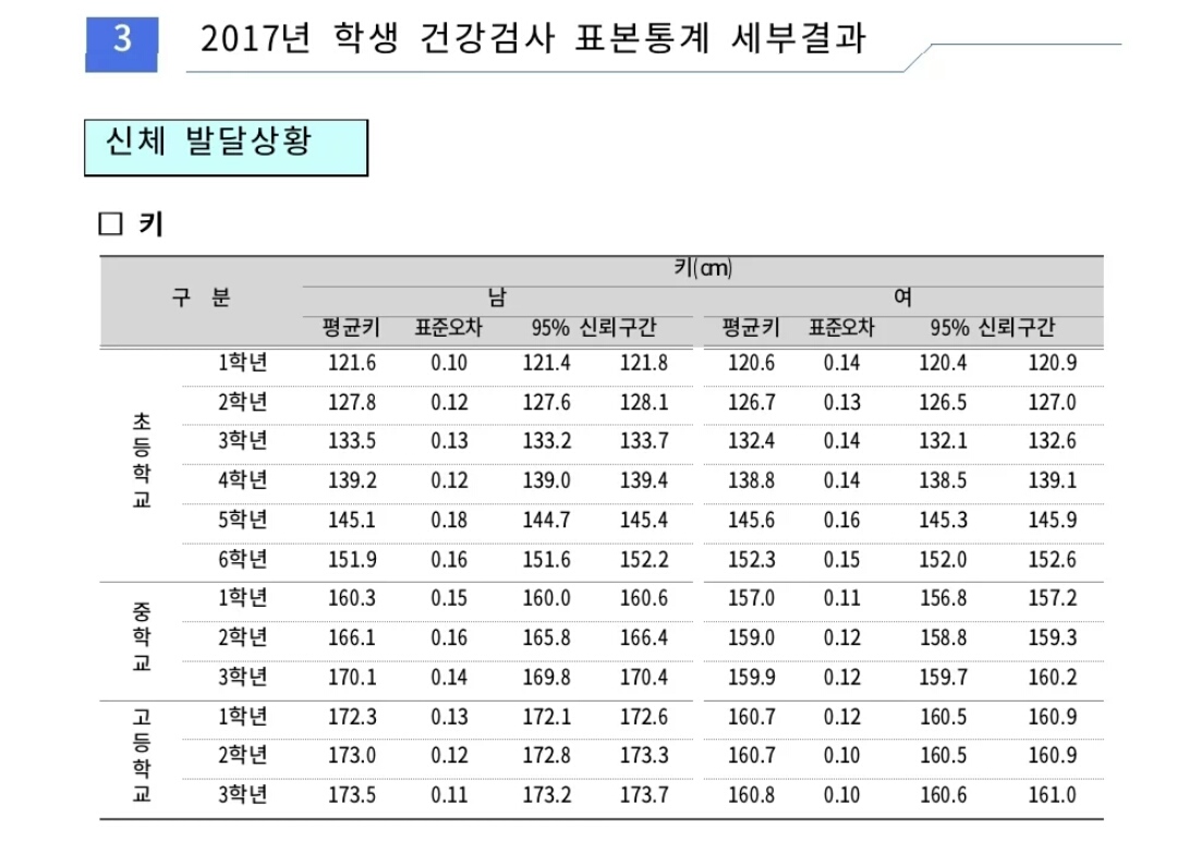 최근 한국 학생들의 신체조사 결과
