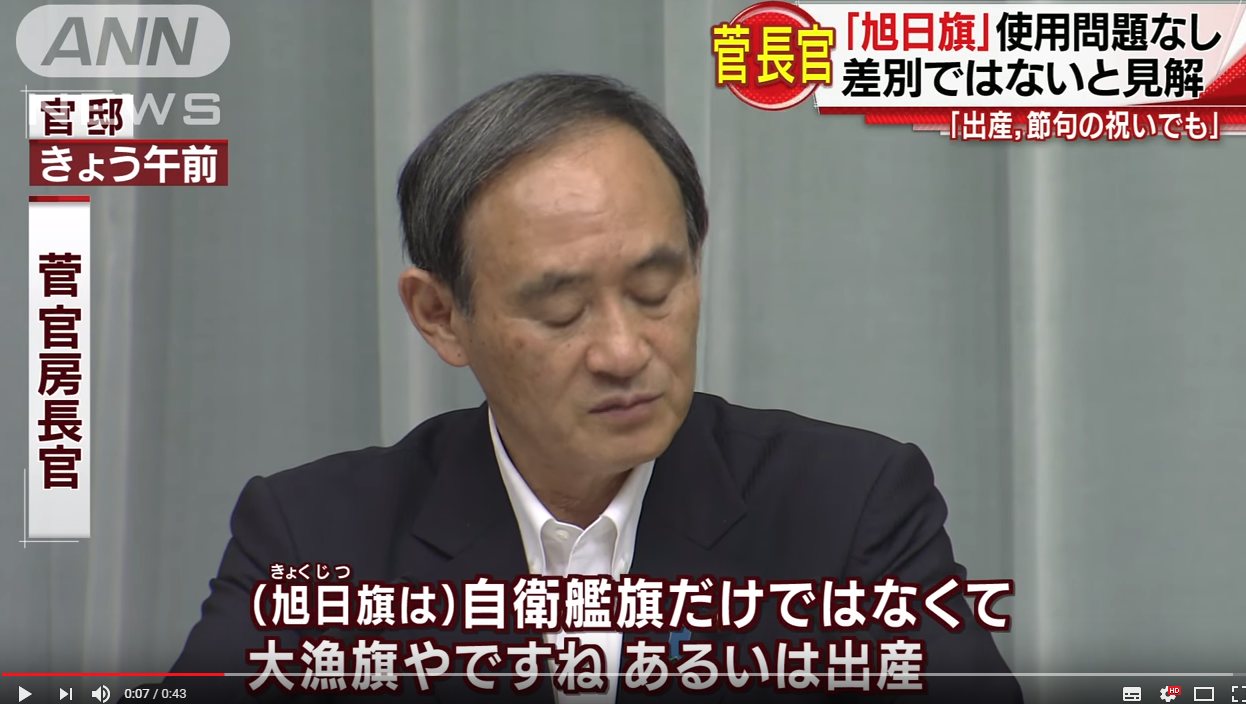すると、菅義偉官房長官は定例記者会見で「旭日旗は日本で幅広く使われている。自衛隊旗や自衛艦旗だけでなく、大漁旗、出産、節句の祝い旗など日本国内で広く使用されている」と述べて、戦犯旗の正当性を公式に主張したことがある。