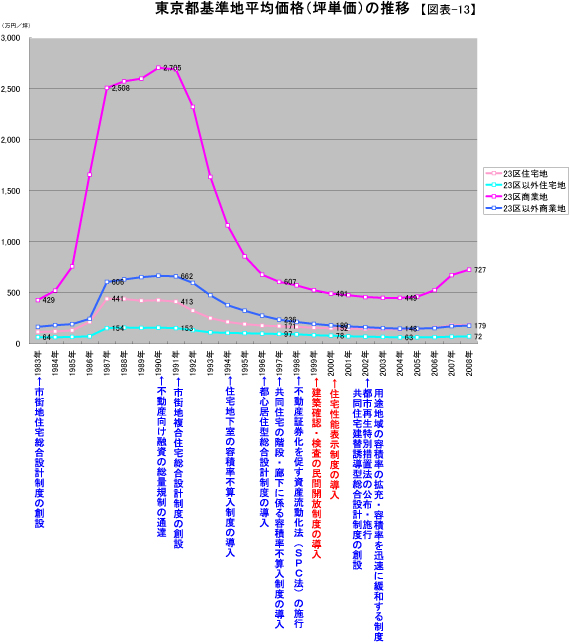 日本の場合、バブル経済の崩壊と、労働人口縮減が、同時に発生しました。最初に株価の下落が始まった。しかしこの時点では、まだ住宅価格は下がらなかった。これは、株価の下落で、投機的な投資が引き上げが発生し、その引き上げ先に安全資産として『不動産』に避難した。この時点では、まだ価格が下がってなかった為に、資産の避難先として『不動産』は、まるで『神話』の様に、根拠無く安全だと信じられていた。しかし、株価の下落が落ち着いて、避難先としての土地神話は崩壊します。結局は、投機であっても、流入する新規需要が無くなると、市場原理に任せて、下落が始まりました。(図は、東京都基準地平均価格の変移です。)