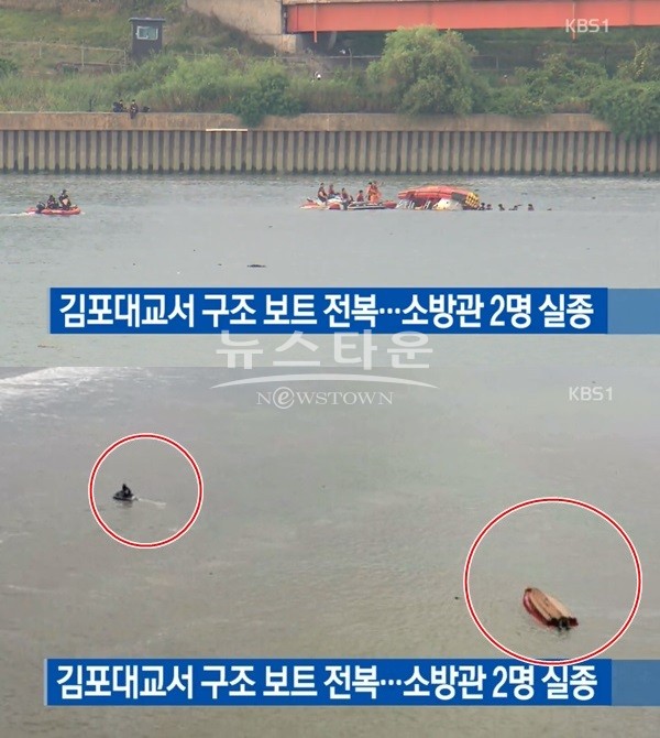 救助艇に乗って問題始発点方向に向かっていた消防士のうち3人が乗ったボートが転覆され、これらの消防2人が行方不明された状況である。