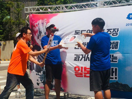 615青学本部、6・15共同宣言実践日本地域委員会青年学生協議会をはじめとする韓国と日本の青年、学生団体は、8月11日午前11時、日本大使館の前で<独島領有権の主張は、韓半島の平和妨害、過去の歴史謝罪ない日本糾弾>光復73石青年学生大会を開き、最近、韓半島の平和な雰囲気に逆行している日本政府を糾弾した。