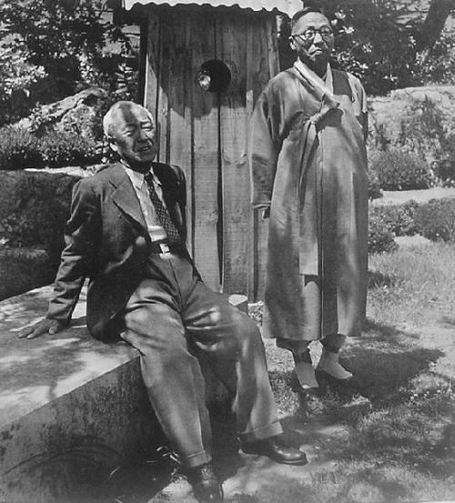 このしゃしん、誕生の右側に並んで立っている背の高い茶色い軍服着た人達は米軍関係者のように見える韓国の初代大統領は李承晩