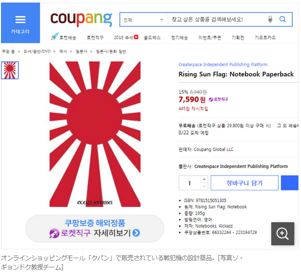 ソ教授は「先週、世界最大のオンラインショッピングモール「アマゾン」で戦犯期のデザインを活用した商品の400以上が販売されていることを確認した後、国内外の有名ショッピングモールを調査した中で、国内のショッピングモールでも販売され、大きな衝撃だった」と述べた。