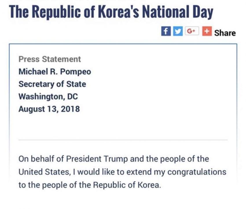 트럼프, 폼페이오. 한국의 광복절을 축하