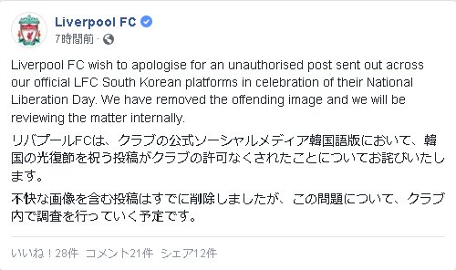 サッカーの英プレミアリーグ・リバプールFCが、韓国語版のツイッターに日本国旗を踏みつけるイラストを投稿した問題で、クラブ側が2018年8月17日(日本時間)に謝罪した。