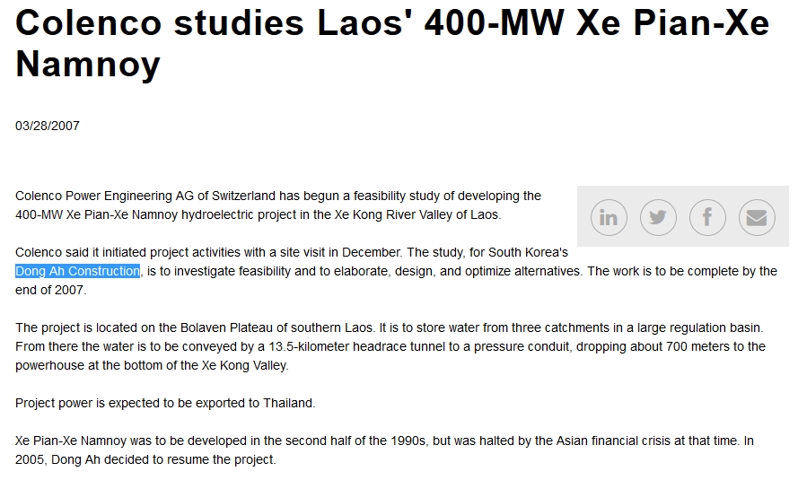 Xe Pian-Xe Namnoy was to be developed in the second half of the 1990s, but was halted by the Asian financial crisis at that time. In 2005, Dong Ah decided to resume the project.