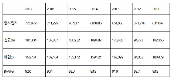 国税庁が18日に明らかにした国税統計によると、昨年飲食店事業をたたみ廃業申告をした件数は16万6751件だった。これは同じ期間に新たに事業者登録をした飲食店18万1304件の92.0%に達する水準だ。昨年飲食店10カ所がオープンする間に9.2カ所が廃業したという意味だ。