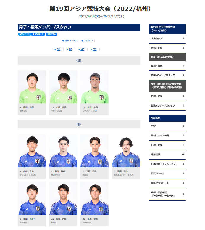 9/24 対 バーレーン杭州アジア大会 U22 日本代表招集メンバー