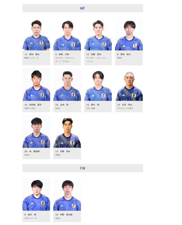 MF 松村優太(鹿島アントラーズ) 松岡大起(グレミオ・ノヴォリゾンチーノ/ブラジル) 佐藤恵允(ブレーメンU23/ドイツ) 重見柾斗(福岡大) 谷内田哲平(京都サンガF.C.) 山内翔(筑波大) 西川潤(サガン鳥栖) 小見洋太(アルビレックス新潟) 角昂志郎(筑波大) 日野翔太(拓殖大)