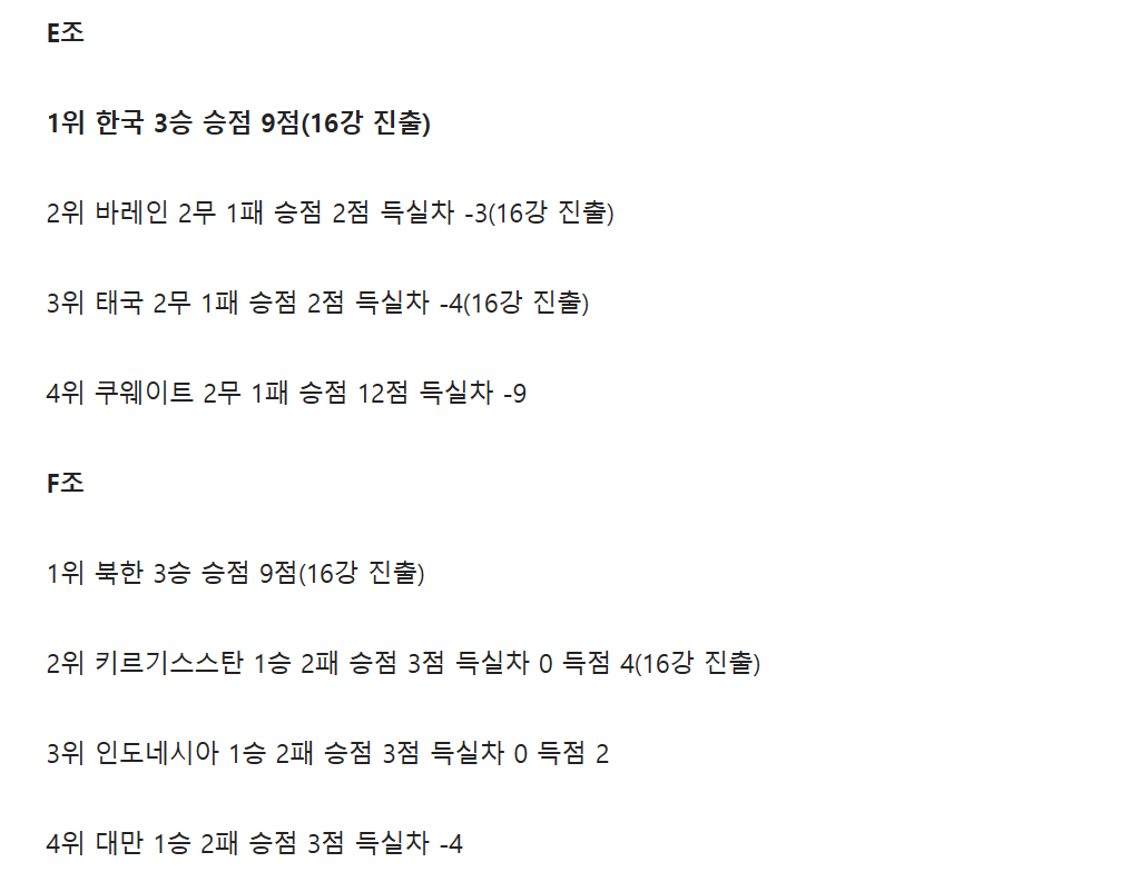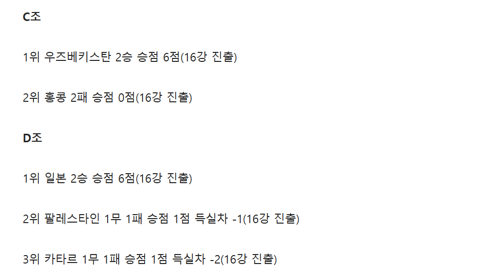 2位 バーレーン2分け1敗 勝ち点2点 得失点差-3(ベスト16進出)