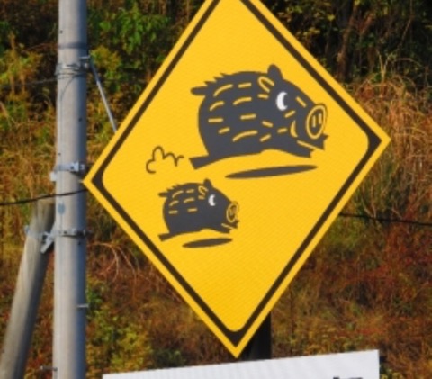 パカパカパカパカパカパカと道路を横断する2匹のイノシシ。