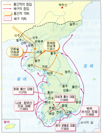 1376년(우왕 2) 7월 충청남도 연산 개태사(開泰寺)에 왜구가 쳐들어와 원수(元帥) 박인계(朴仁桂)가 전사하는 등 피해가 심하자 최영은 출정을 자청하여 충청남도 홍산에서 왜구를 거의 전멸시켰다. 이 싸움에서 최영은 몸에 적의 화살을 맞고도 끝까지 부하들을 진두지휘하였다. 이후부터 왜구들은 최영을 백수 최만호(白首崔萬戶)라 불렀다고 한다. 1380년(고려 우왕 6)에는 나세·심덕부·최무선등이 화포를 사용하여 금강어구의 진포(鎭浦)에 정박한 왜선 500여척을 모두 불태웠다. 이때 살아남아 남부지역을 노략질하던 왜구를 이성계가 지리산 황산(荒山)에서 크게 무찔러 왜구의 기세를 완전히 꺾을 수 있었다. 1383년에는 정지(鄭地)가 남해 관음포에서 큰 전과를 올렸고, 1389년(창왕 1)에는 박위(朴位)가 전함 100척을 거느리고 왜구의 본거지인 쓰시마를 소탕하였다.이후 한동안 왜구의 침입은 뜸해졋다.고작 두 번 쳐들어갔다가 실패한 원정을 갖고 4세기 동안 보복한 걸 보면 과연 지금 상황이 이해되는