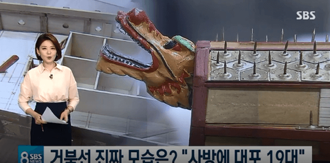 [チェヨンソク/科学技術連合大学院大学教授:李舜臣将軍が使用していた亀甲船は、竜頭から砲を発射することができたし、尾がついていて、天字・地字・玄字・黃字の四つの艦砲を載せていました。]
