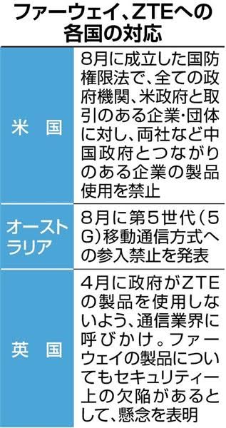 中国通信機器2社を入札から除外 日本政府方針 安全保障で米豪などと足並み