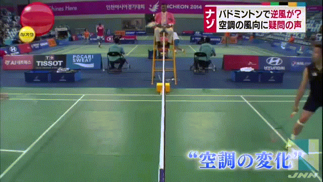 バドミントン男子団体準々決勝の日本対韓国戦で田児賢一が第1ゲームを先取した後、2ゲーム以降に不可解な向かい風が吹いて逆転負けした。第1ゲームでは無風だったが、第2ゲームでは向かい風が吹き、コートチェンジした第3ゲームでは風向きが変わるはずだが何故か再び向かい風であった。