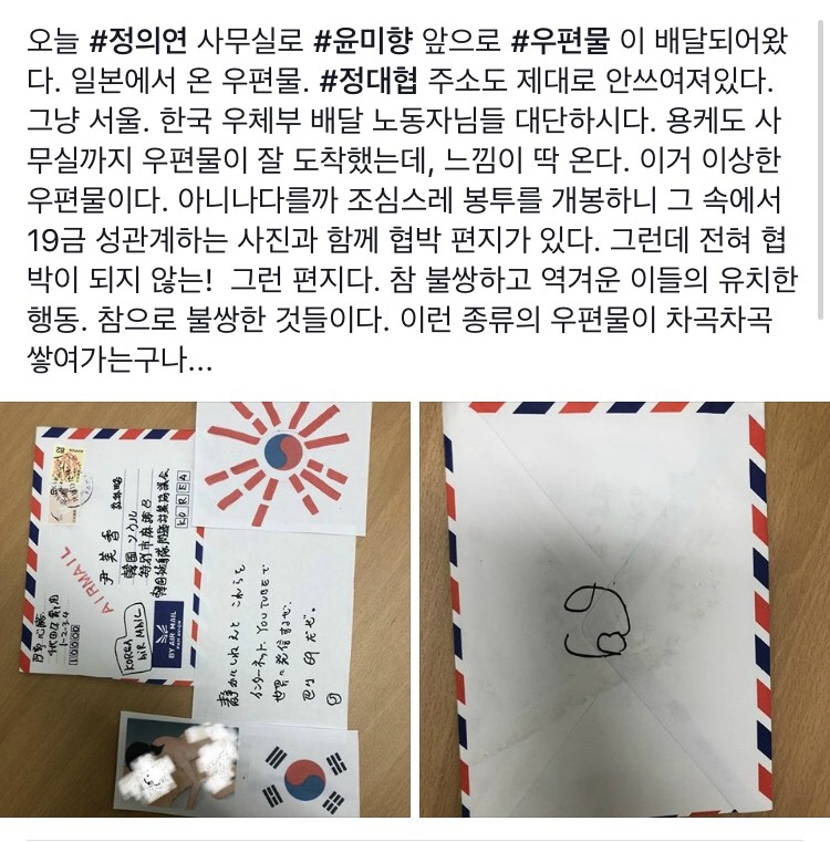 “ 오늘 #정의기억연대 사무실로 #윤미향 앞으로 #우편물 이 배달되어 왔다. 일본에서 온 우편물. #정대협 주소도 제대로 안 적혀 있다. 그냥 서울. 한국 우체부 배달 노동자님들 대단하시다. 용케도 사무실까지 우편물이 잘 도착했는데, 느낌이 단번에 온다. 이거 이상한 우편물이다. 아니나다를까, 조심스레 봉투를 개봉하니 그 속에서 성관계 사진과 협박 편지가 있다. 그런데 전혀 협박이 되지 않는! 그런 편지다. 참 불쌍하고 역겨운 이들의 유치한 행동. 참으로 불쌍한 것들이다. 이런 종류의 우편물이 차곡차곡 쌓여가는구나...”