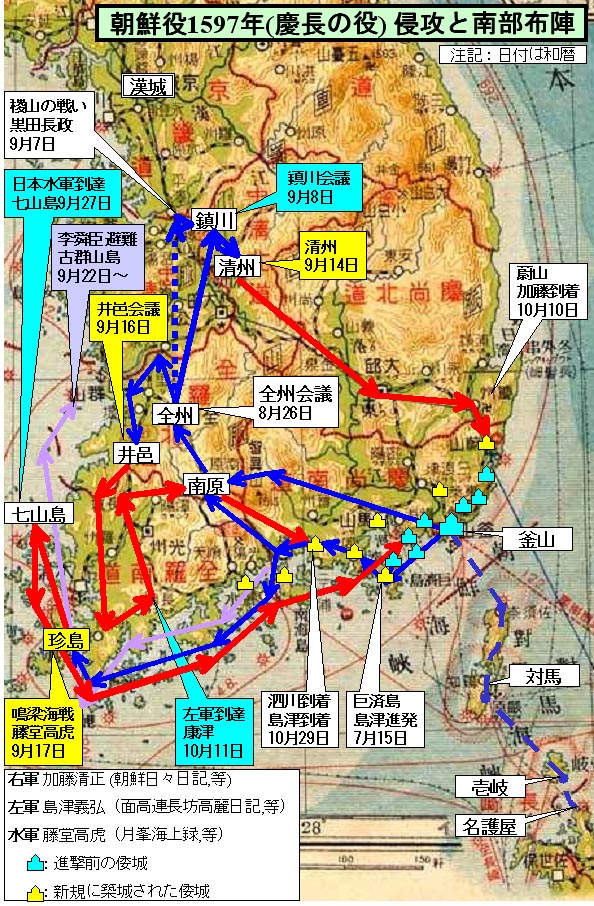 順天、南海、泗川、固城、唐島瀬戸口(見乃梁)、昌原(馬山)、梁山、蔚山の築城は、鳴梁海戦の後。