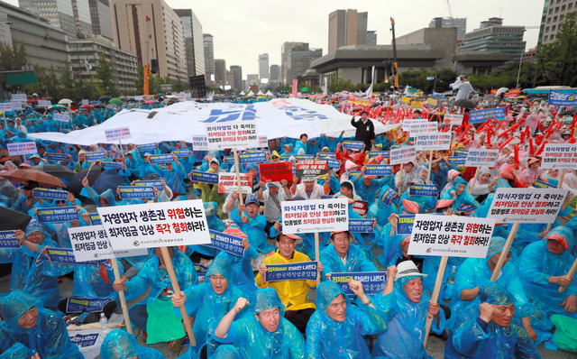 ソウル中心部の光化門(クァンファムン)で29日午後、文在寅(ムンジェイン)政権が推進する最低賃金の引き上げ政策に反対する自営業者らの集会があった。豪雨のなか、主催者側の発表で約3万人(警察集計は1万5千人)が「自営業者の生存権を脅かす政策を撤回せよ」などと書かれたプラカードを掲げ、文政権を批判した。