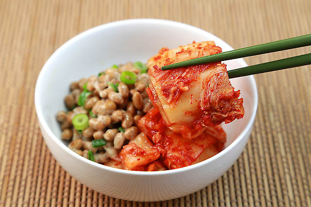 俺は白米の上に納豆とキムチを半分ずつ載せて食べる。