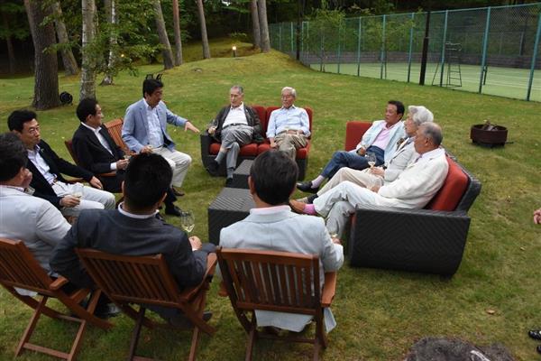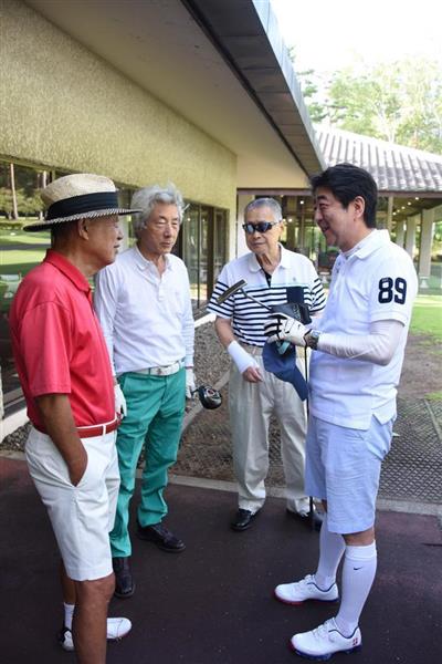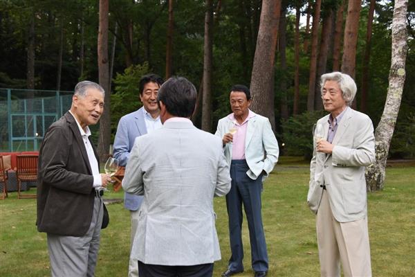 日本財団の笹川陽平会長が31日、自身のブログで今月15日に山梨県鳴沢村の別荘で開いた、安倍晋三首相と森喜朗元首相らとの夕食会や、翌日のゴルフの様子をとらえた写真6枚(笹川氏のブログより)を公開した。食事中に小泉純一郎元首相らも一緒になって大笑いする場面などが収まっており、夏休み中でリラックスした安倍首相らの表情が伺える。