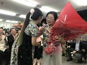 当選確実を喜ぶ城間幹子氏(21日夜、那覇市内の事務所)>>241