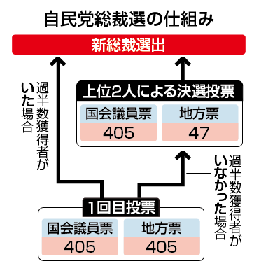 9月の自民党総裁選は、2013、14両年に改正された総裁公選規程が初めて適用される見通しだ。改正の要点は、党員・党友の投票を基に算出される「地方票」がより重みを持つ仕組みになったこと。1人1票の国会議員票と同等の比重にしたほか、決選投票にも反映されることになった。
