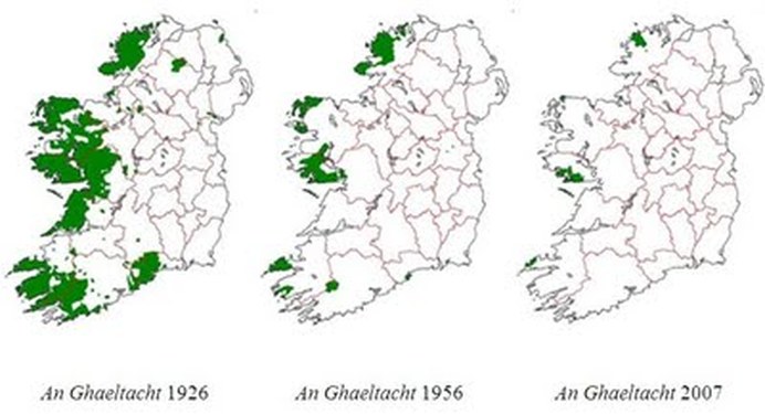 켈트어 계통으로 본래는 아일랜드의 중심이 되는 언어였으나 아일랜드가 영국의 지배를 받은 이후로, 몇 백년동안 아일랜드어 사용인구는 점차 줄어들어서 아일랜드 독립 당시에는 아주 외딴 시골에나 남아있는 언어로 전락하게 되었다. 그나마 800년이나 버텼으나 아일랜드 대기근을 결정타로 하여 결국은 영향력을 상당히 상실한 언어로 전락하였다. 하지만 아일랜드인들의 독립 정신이 고취되던 무렵에 아일랜드어 부흥을 위한 노력이 시작되었으며, 1937년 영국으로부터 독립하여 공화정이 수립되면서 헌법에 아일랜드어를 국어(national language)이자 제1공용어, 영어를 제2공용어로 명시하는 등 부흥운동을 본격화했다. 아일랜드어 교육을 의무화하고, 공무원 임용시험 필수과목으로 포함시켰다.