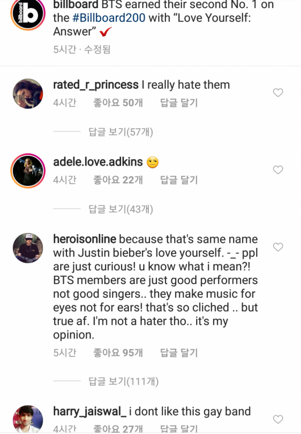 방탄소년단 빌보드 차트에 적힌 미국인들의 레스