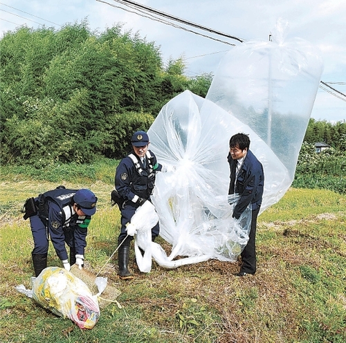 乾電池は韓国の市販品とみられ、朝鮮半島から来た可能性があるという。秋田市でも9月に同様のバルーンが見つかっており、山形県警は関連や、液体の成分を調べる。