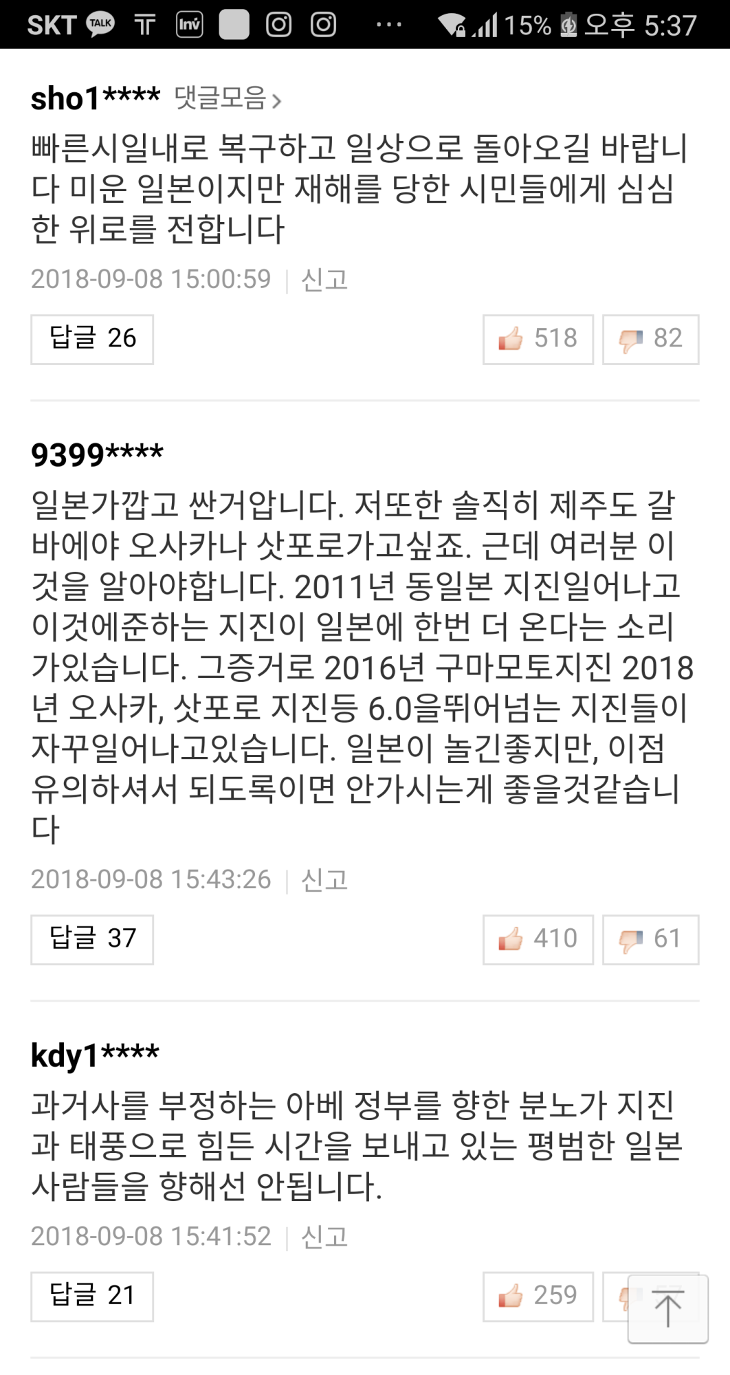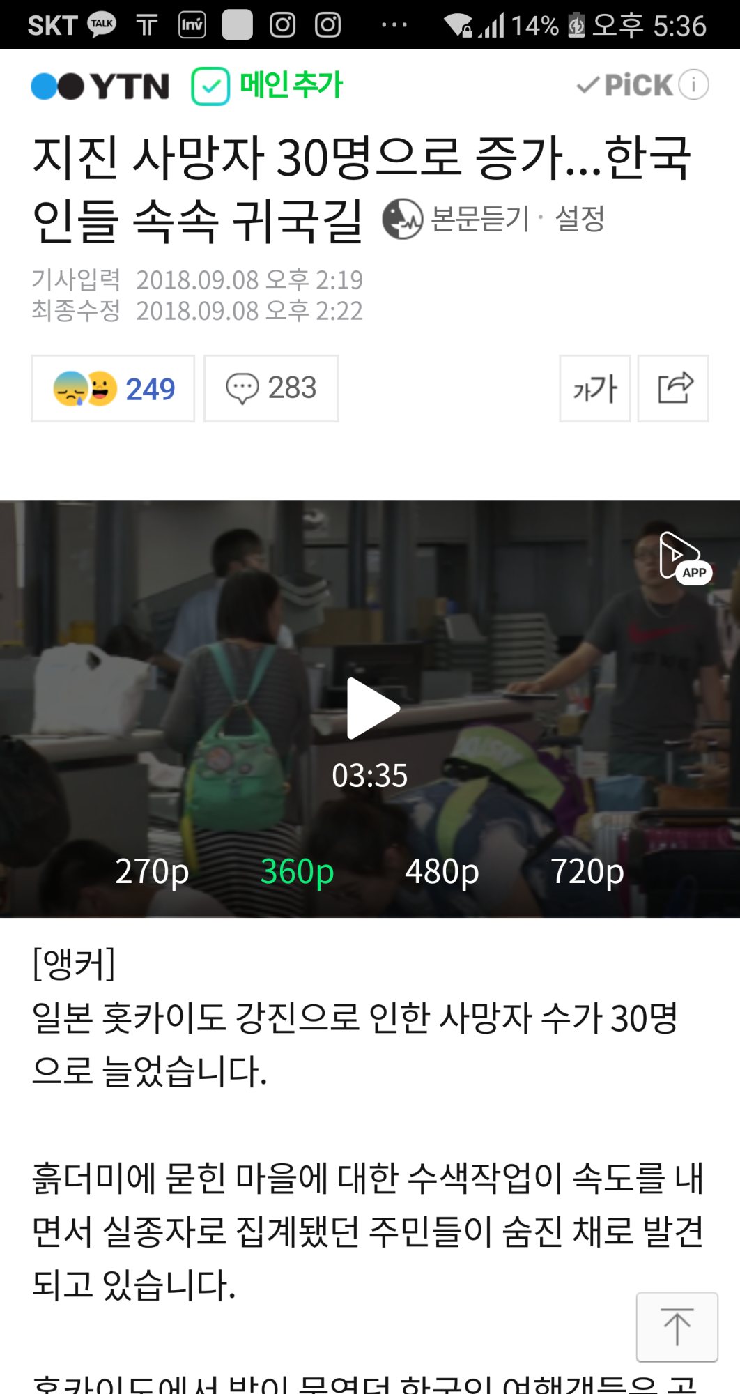 한 한국인 여성은 신치토세공항에서 올린 인스타그램에 "(강진으로) 비록 (홋카이도의 유명 관광지인) 오타루(小樽)는 못 갔지만 다치지 않고 무사히 돌아가게 돼서 감사하다"고 말했다.