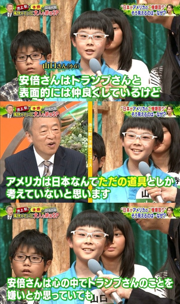 何故ならこういう番組でしか情報を享受できないアホ向けに番組が作られてるから普通の子供はトランプも安倍も興味ないよね