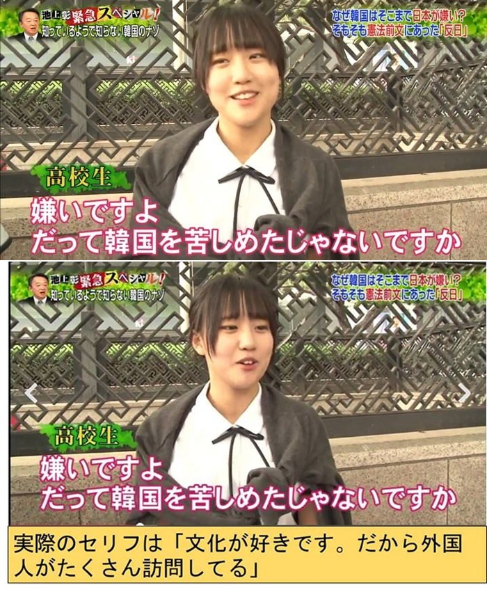 TVの翻訳では「嫌いですよ、だって韓国を苦しめたじゃないですか」と答えているが