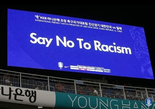 11日、韓国とチリのAマッチが開かれる前に水原(スウォン)ワールドカップ(W杯)競技場の電光掲示板に流された文章だ。国際サッカー連盟(FIFA)の人種差別反対のフレーズが韓国Aマッチに露出したのは初めてではない。だが、フレーズが目についた理由はチリ選手団の相次いだ人種差別行為のためだった。