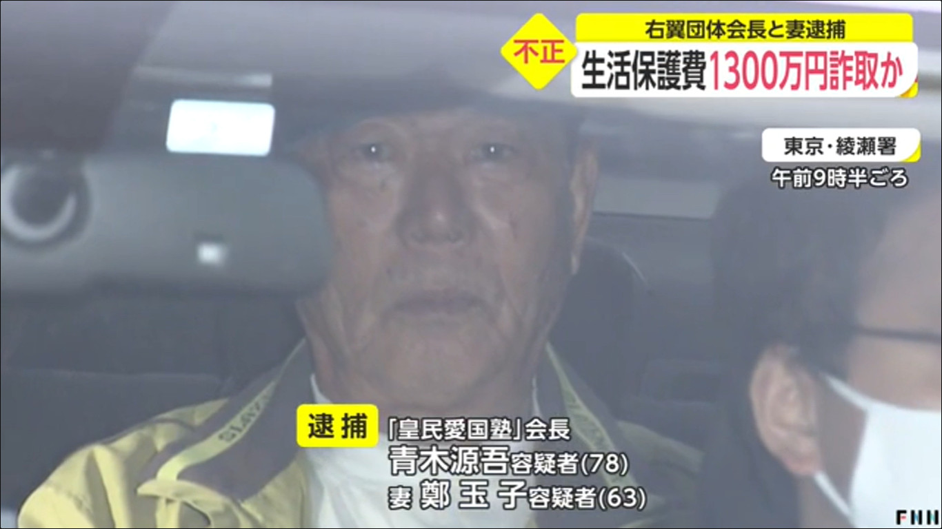 「皇民愛国塾」会長の青木源吾容疑者(78)と、妻で韓国籍の鄭玉子(チョン・オクチャ)容疑者(63)は、およそ6年の間、多いときに月35万円あった土木関係の収入を隠して無職を装い、埼玉・三郷市から生活保護費およそ1,300万円をだまし取った疑いが持たれている。