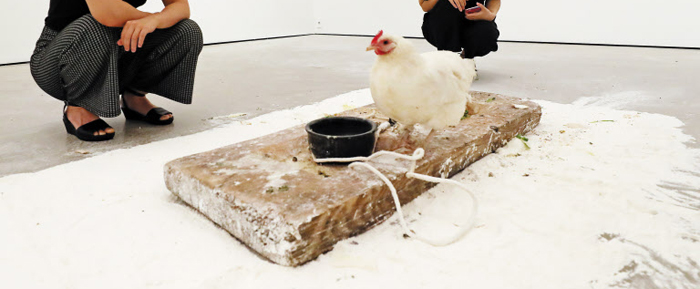 去る8日、ソウル鍾路区サガンドン「ギャラリー現代」の動物保護団体「MOVE」の活動家7人が乱入して20分間占拠デモを行った。洋画がイガンソ(75)さんの作品が「動物虐待」であると主張した。この作家は白い粉末の上に生きた鶏を解放鶏として残した糞の痕跡を作品として展示していた。MOVE活動家たちは、「作品を作る過程で鶏の行動半径を制限するために鶏の足首をひもで縛ったのは、動物虐待」とした。