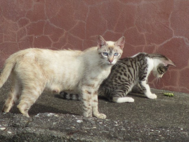 母猫が子猫に、獲物を渡して