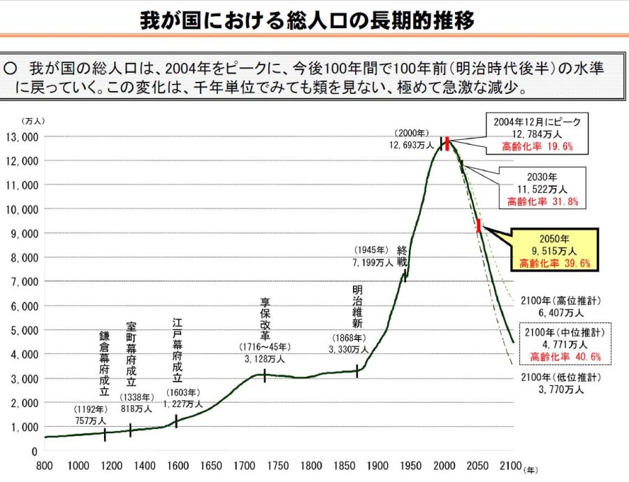 일본국의 총인구는, 2004년을 정점으로, 이후 100년간 100년 전(메이지시대 후반)의 수준으로 되돌아간다.