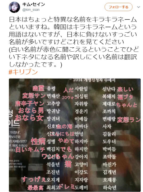 名前には使わない漢字だったり、該当する漢字が無かったり。どっかのスレで書いてたが、韓国では親や親戚の意見が強いので、子供に変った名前を付け辛いと