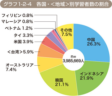 人口比率で見ると韓国人の、日本語学習者は、ダントツでトップ。