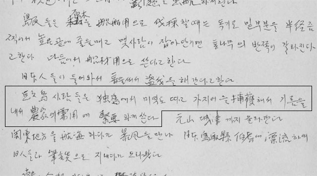 東亜日報はいくら貰って本の宣伝をしているのか?>キム氏の息子であるテス氏(76)を通して入手したこの記録には、巨文島と近隣の草島などの住民たちの生活史と関連して、鬱陵島(ウルンド)や独島に関するいくつかの貴重な記憶が含まれている。記録狂であるキム氏は、本人が認知している事実と住民から聞いた内容を1960年代から記録してきた。