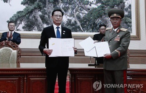 韓国と北朝鮮は19日、平壌で開かれた南北首脳会談で採択した「板門店宣言の履行に向けた軍事分野合意書」で、いかなる場合でも武力を使用しないことで合意した。合意書によると、南北は地上、海上、空中をはじめとするあらゆる空間で、軍事的緊張と衝突の根源となる、一切の敵対行為を全面中止することにした。
