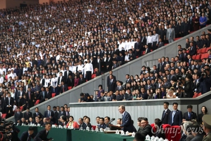 ムン・ジェイン大統領が訪朝二日目の19日午後綾羅島5・1競技場で大マスゲームを観覧しながら15万人の北朝鮮の観覧客に挨拶をする予定だと、大統領府が明らかにした。