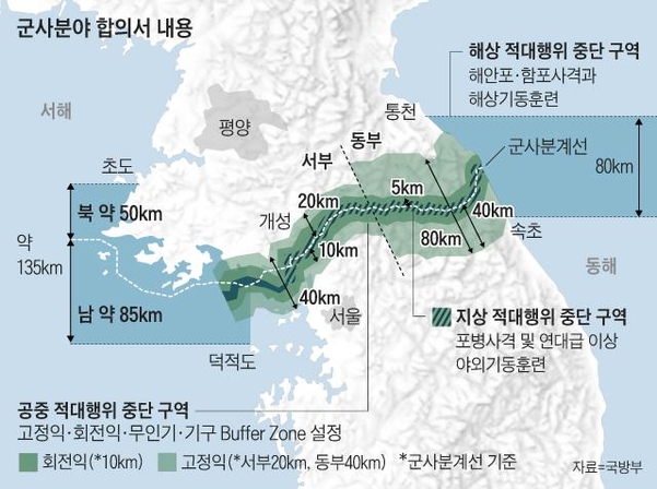 南北軍当局が19日に設定した「海上敵対行為中断区域」の黄海区間が、政府が当初発表した80kmではなく、135kmで確認された。当初、軍当局は、西海の緩衝水域が南側40km、北側40kmずつすべて80kmと明らかにした。
